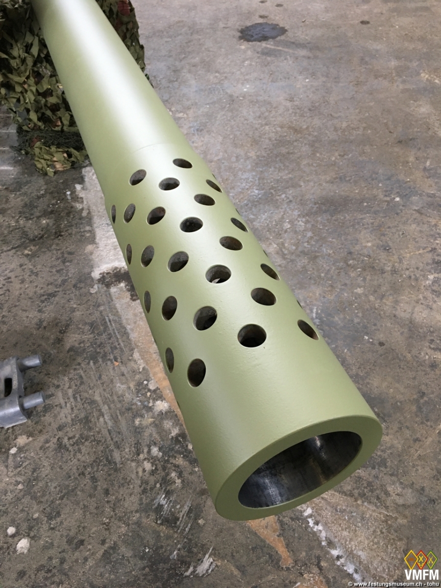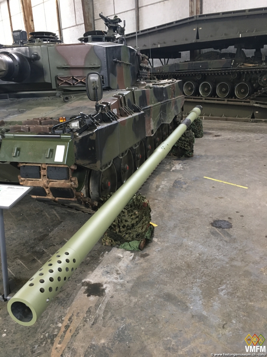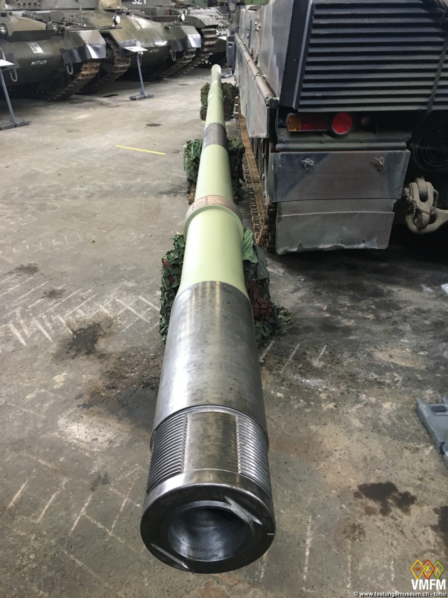 1987 wurden die Kampfpanzer Leopard 2 mit einer Glattrohrkanone im Kaliber 120mm in der Schweizer Armee eingeführt. Bereits 1989 machte die RUAG Versuche mit einer 140mm Glattrohrkanone, die auf den Leopard 2 mit dem Kontrollschild M+810 erprobt wurde. Bei diesem Versuch handelte es sich nicht um ein militärisches Entwicklungsprojekt, sondern lediglich um ein Funktionsmuster. Das Rohr mit einer Länge von 10,5 Meter (!) erbrachte im Test eine Anfangsgeschwindigkeit des Geschosses von 1‘900 m/s. Das Versuchsrohr wie auch der damals verwendete Leopard 2 mit dem Kontrollschild M+810 sind heute im Militärmuseum Full ausgestellt.