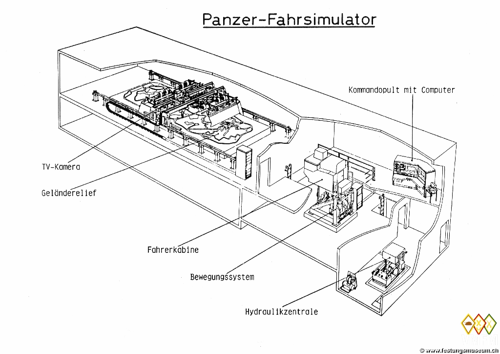 Der Fahrschüler befand sich in einer dem Fahrerstand detailgetreu nachgebildeten Kabine mit einem Bildschirm vor sich. Die unter der Fahrerkabine befindliche Hydraulik sorgte für die realistischen Bewegungen des Fahrerstandes. Grundlage bildete ein ca. 12 Meter langes, detailliertes Geländemodell. Über diesem war ein Laufwagen mit Kamera und unten im „Gelände“ ein Fühler mit dem Objektiv der Kamera montiert. Entsprechend den Lenkbewegungen des Fahrers fuhr dieser Fühler durch das Gelände und übermittelte das aufgenommene Bild auf den Bildschirm vor dem Fahrer und die Bewegung im Gelände auf die Hydraulik der Fahrerkabine. Insgesamt vermittelte dieser Simulator ein äußerst realistisches Fahrerlebnis. Nebst dem großen Geländemodell und der hydraulischen Anlage waren für den Betrieb der Anlage verschiedene voluminöse Rechner erforderlich.