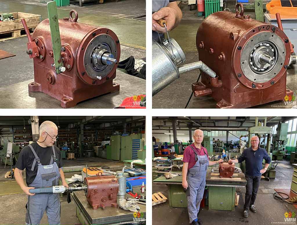 Nach langwierigen Versuchen ist es uns tatsächlich gelungen, das Getriebe wieder zusammenzusetzen und bei der Fa. Spitznas einen Probelauf durchzuführen. Ein erster vorsichtiger Versuch mit einer Bohrmaschine als Antrieb verlief vielversprechend, und Herr Rohde schien nur unwesentlich weniger nervös als ich, als wir am nächsten Morgen den Startknopf der grossen Testanlage betätigten und nach verdächtigen Geräuschen lauschten.