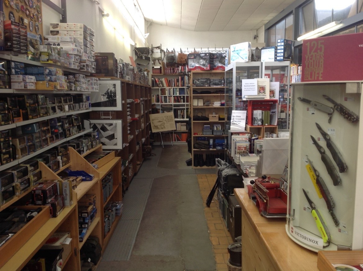 Beim Ausgang aus dem Hauptgebäude finden Sie den Museumsshop mit einem reichhaltigen Angebot an Fachliteratur, Militaria, Modellen und Bausätzen